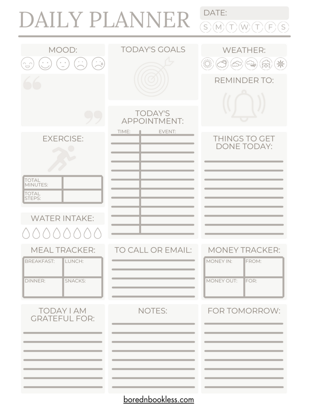 Single sheet Free Daily planner Template for Supernote A6x with Goals, Things to do, Appointments, meal and exercise tracker