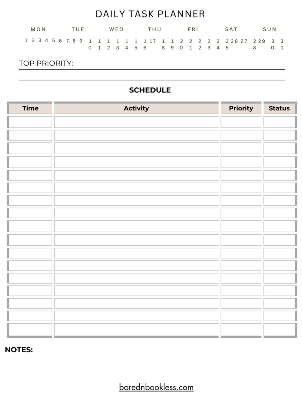 Single sheet Free Daily Task Planner Template for Supernote A6x with based on timeline, priority and completion status